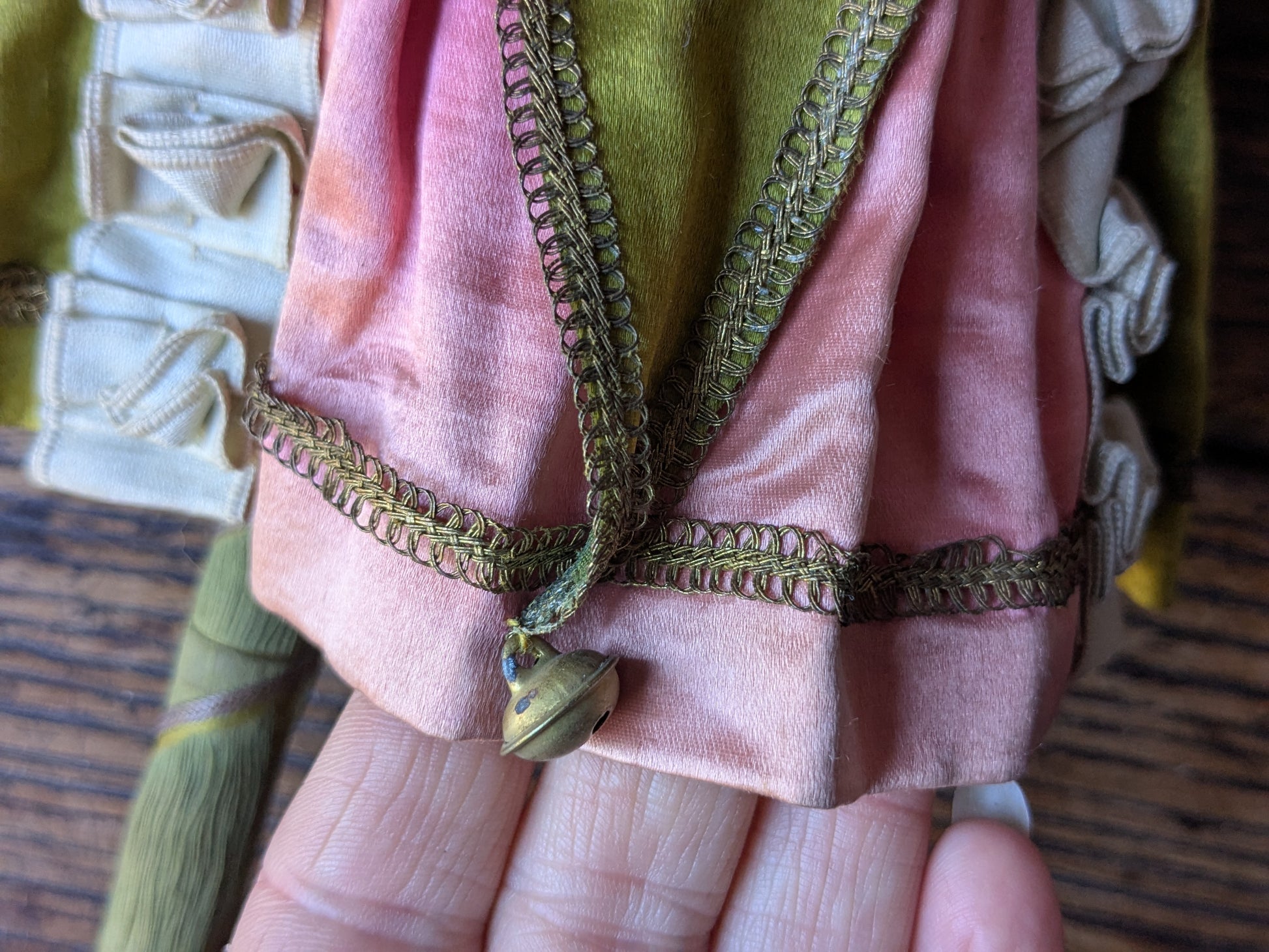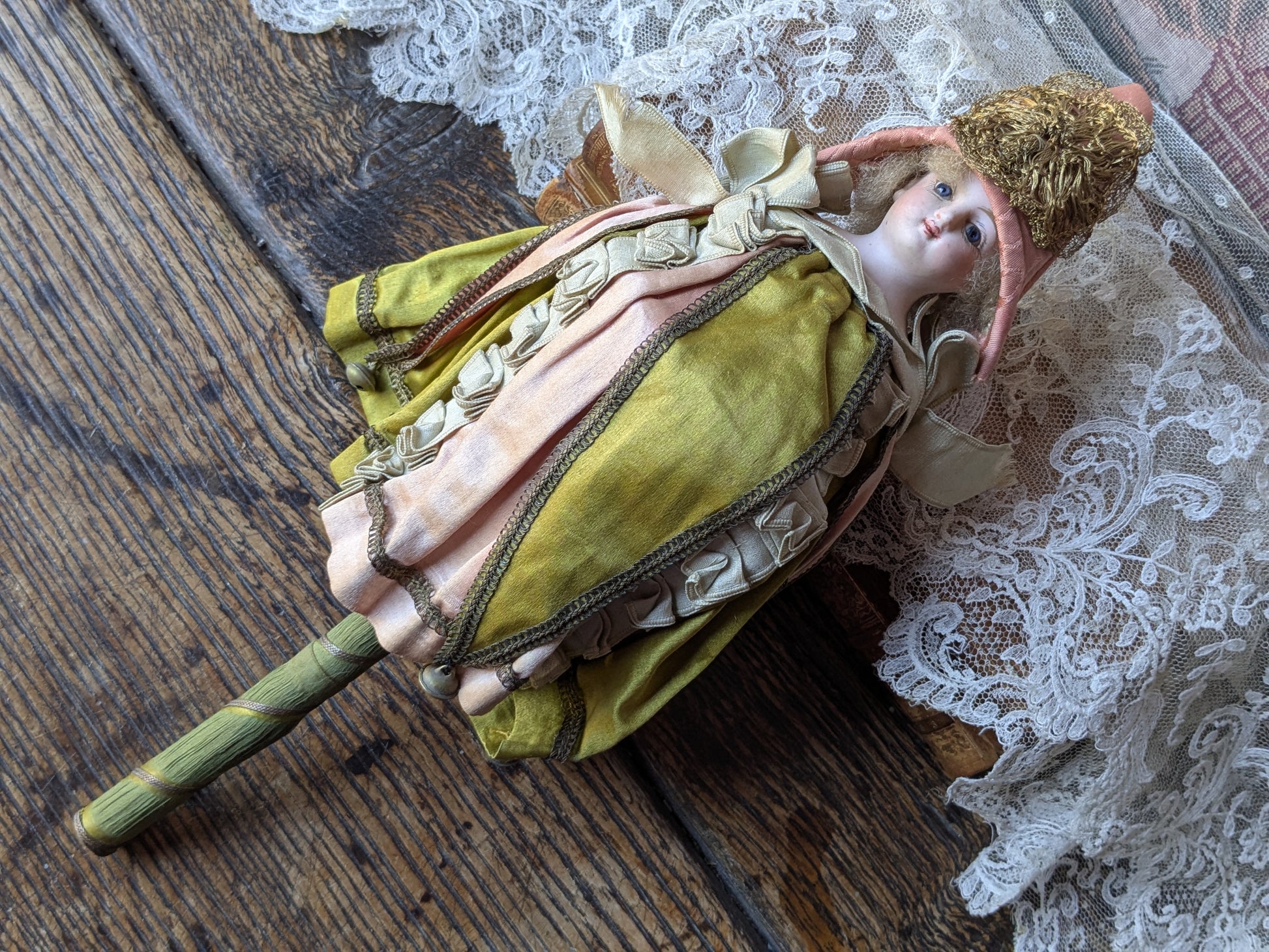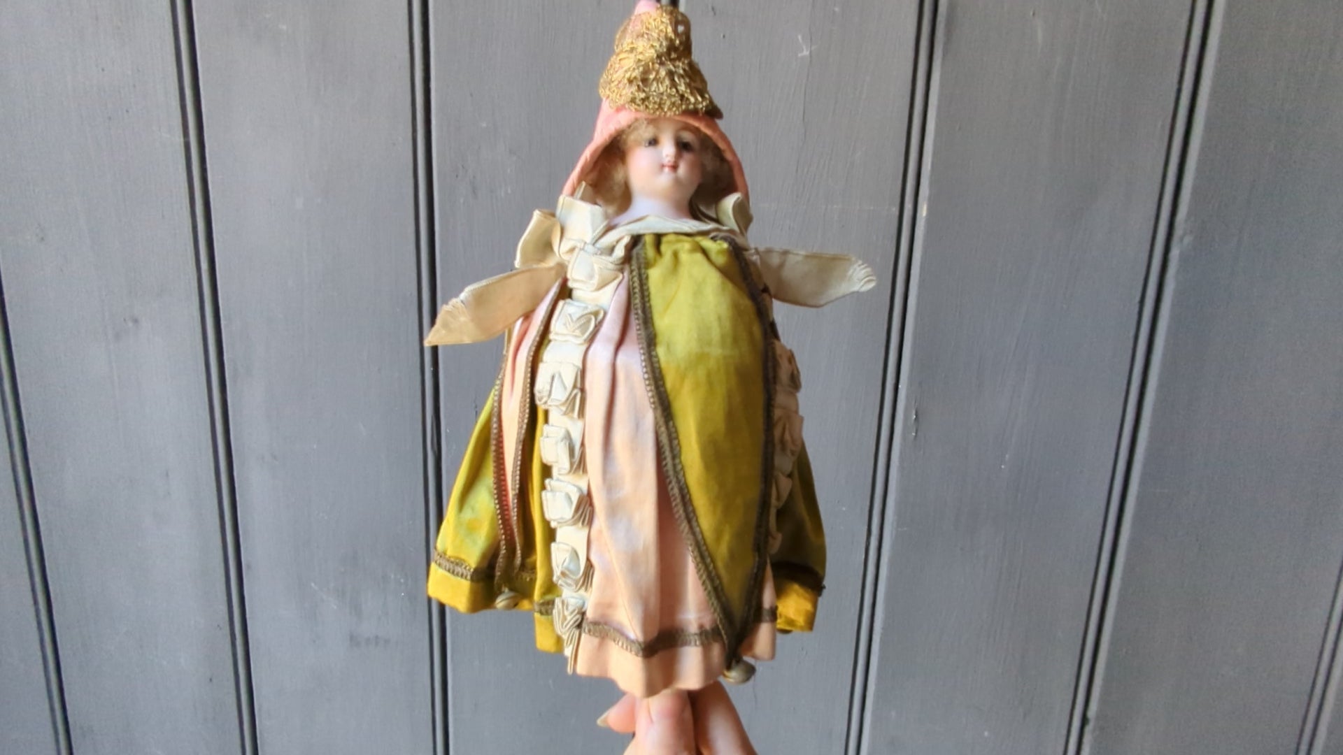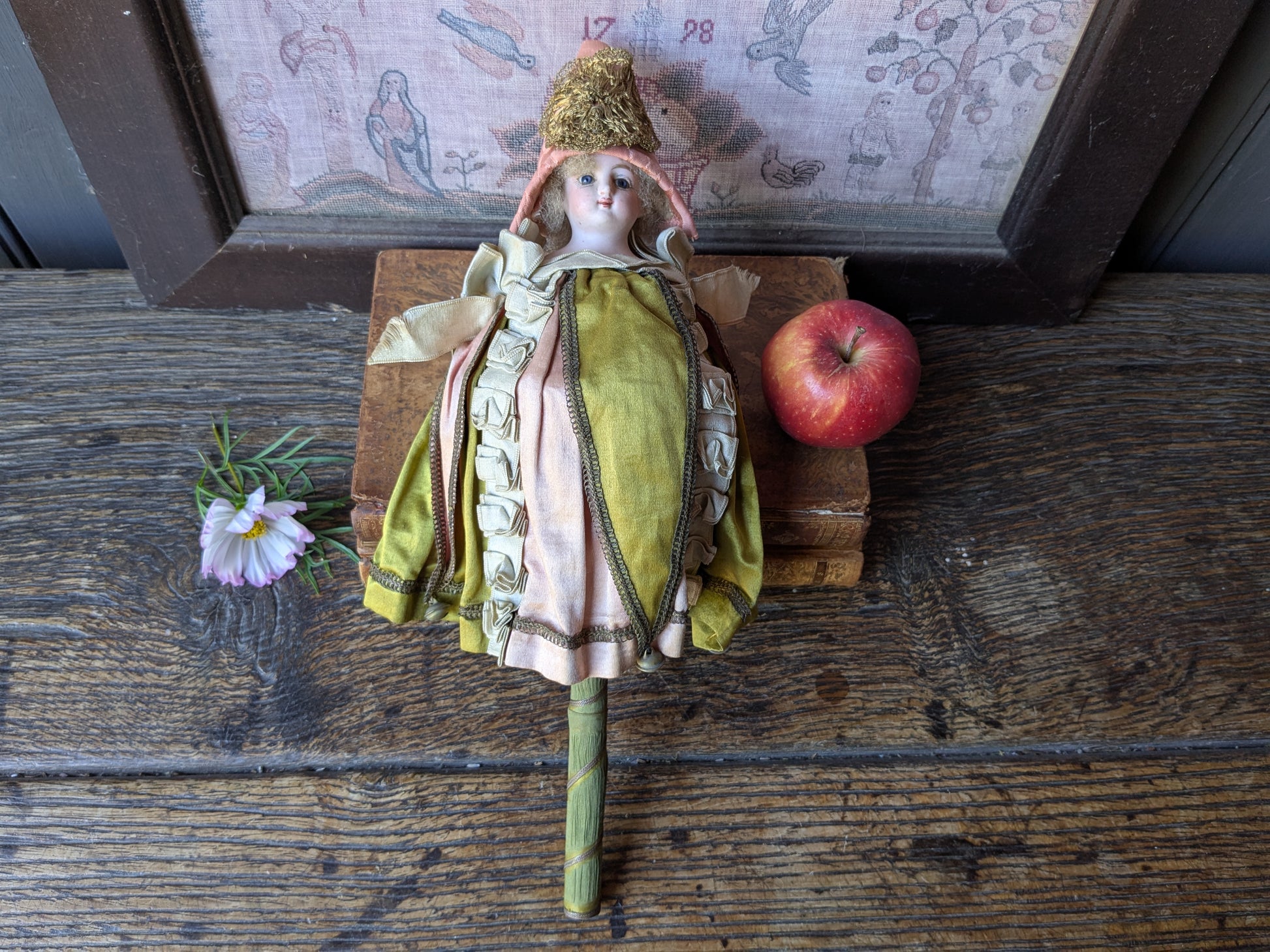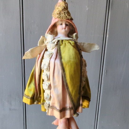 A beautiful musical marotte doll. She has her original clothes (apart from the hat which is a replacement made from antique silk). The musical mechanism still works when she spins.