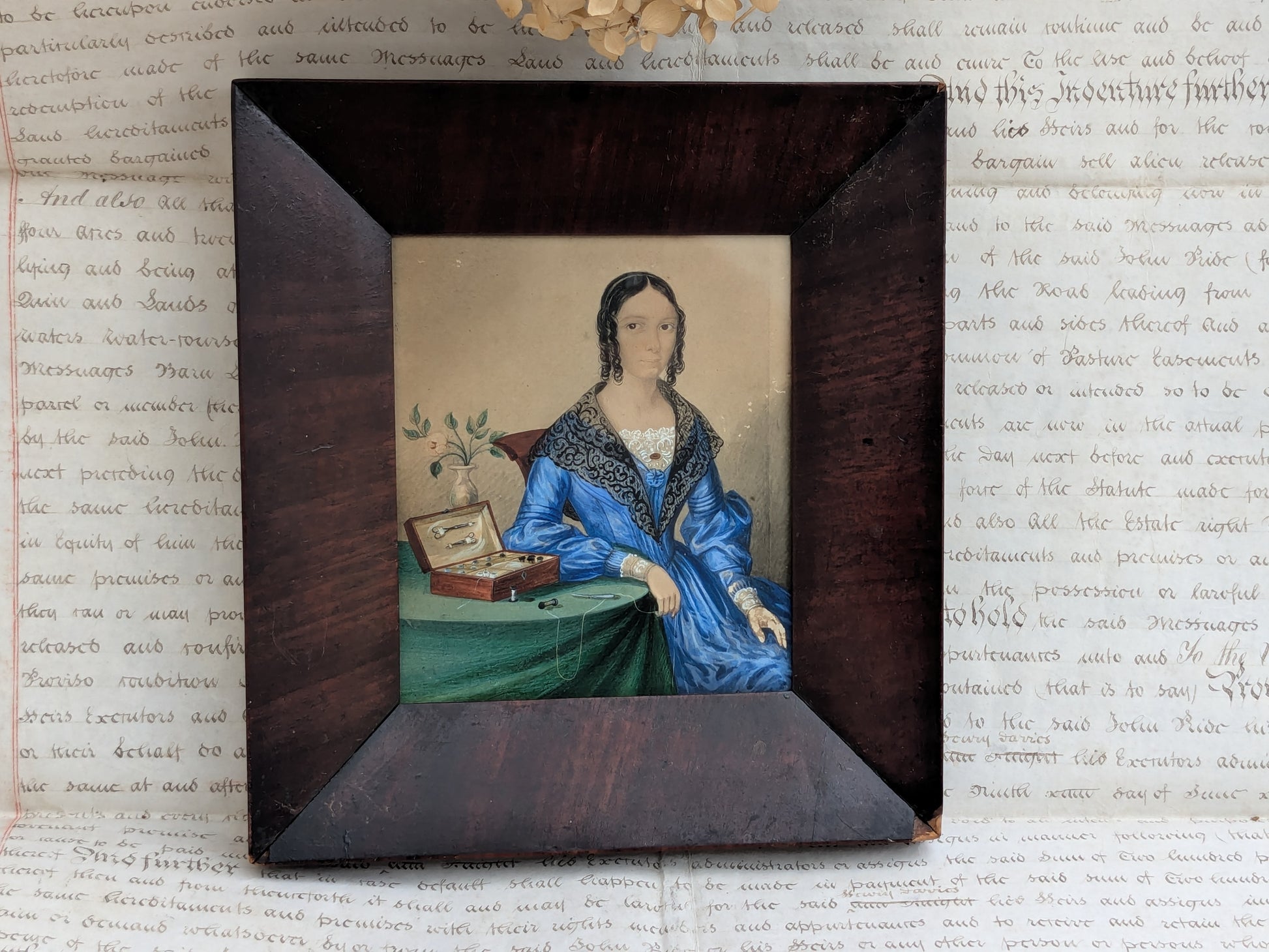 A beautiful antique portrait miniature of a Victorian lady with her work box. The detail is exquisite.