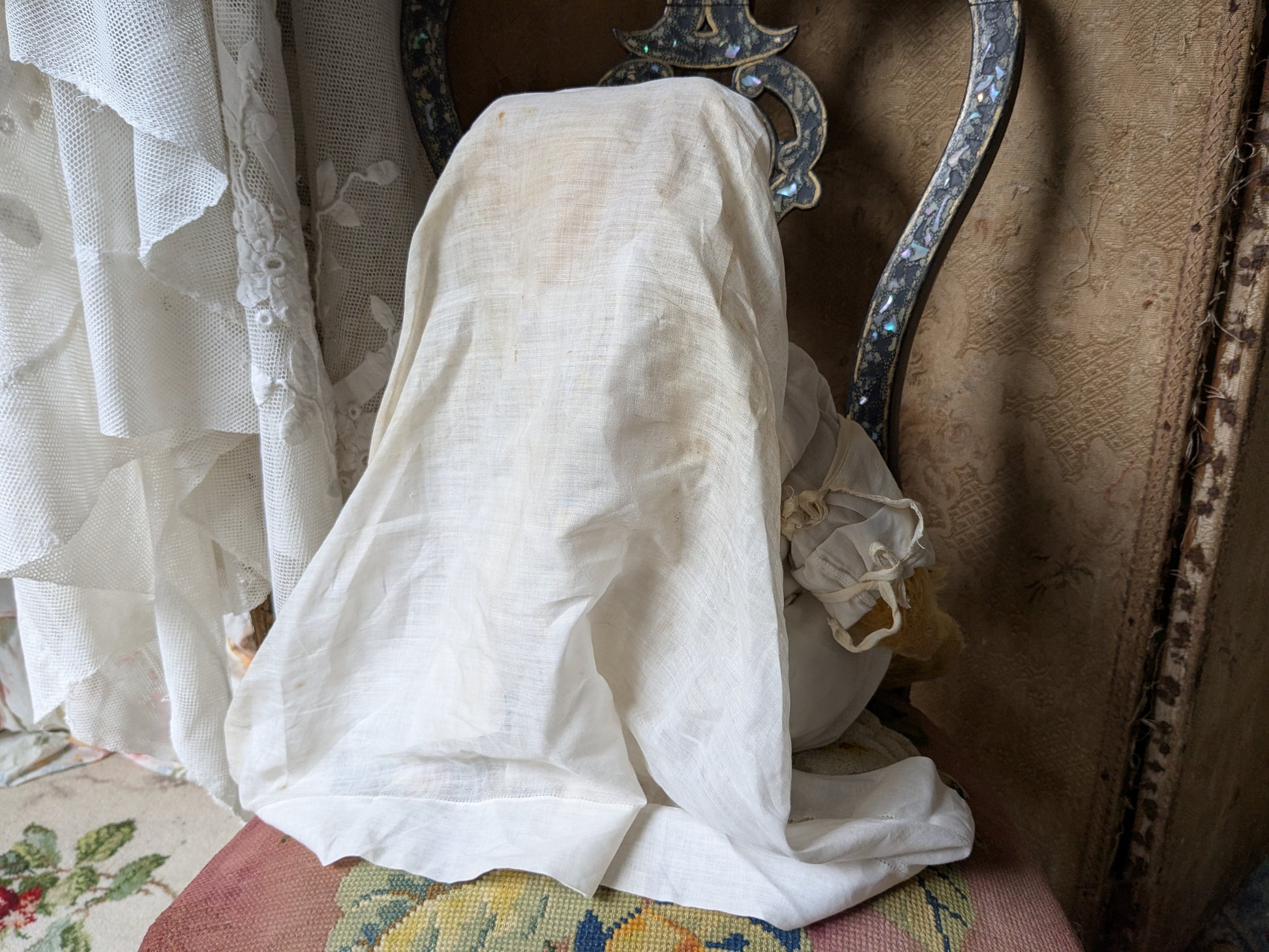 A vintage Pedigree teddy bear which has been dressed as a nurse at some time in the past. She has wear to the front of her body as shown. The eyes are plastic & her joints are working.