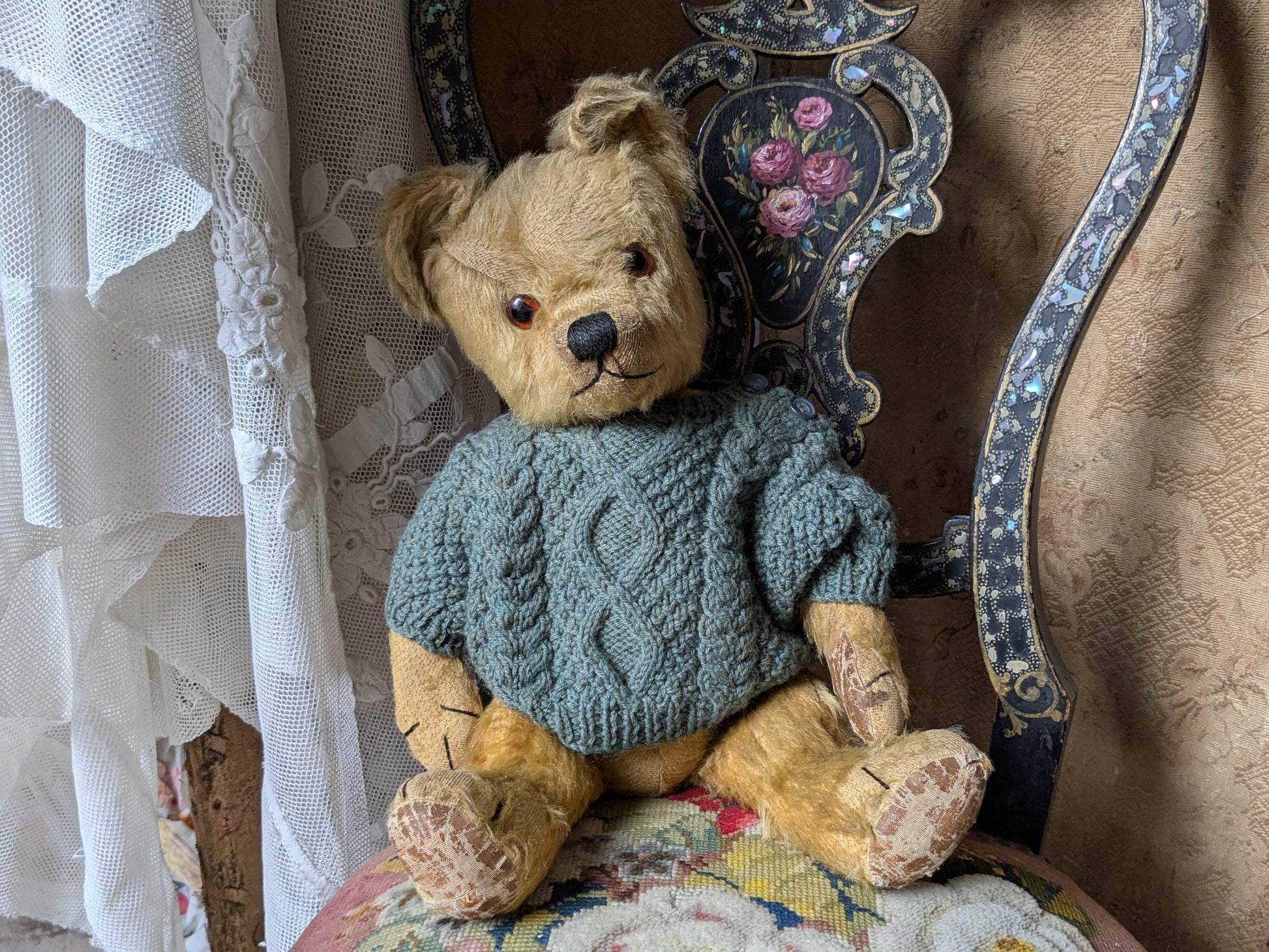 A vintage teddy bear with glass eyes & rexine paw pads. He wears a little hand knitted jumper.