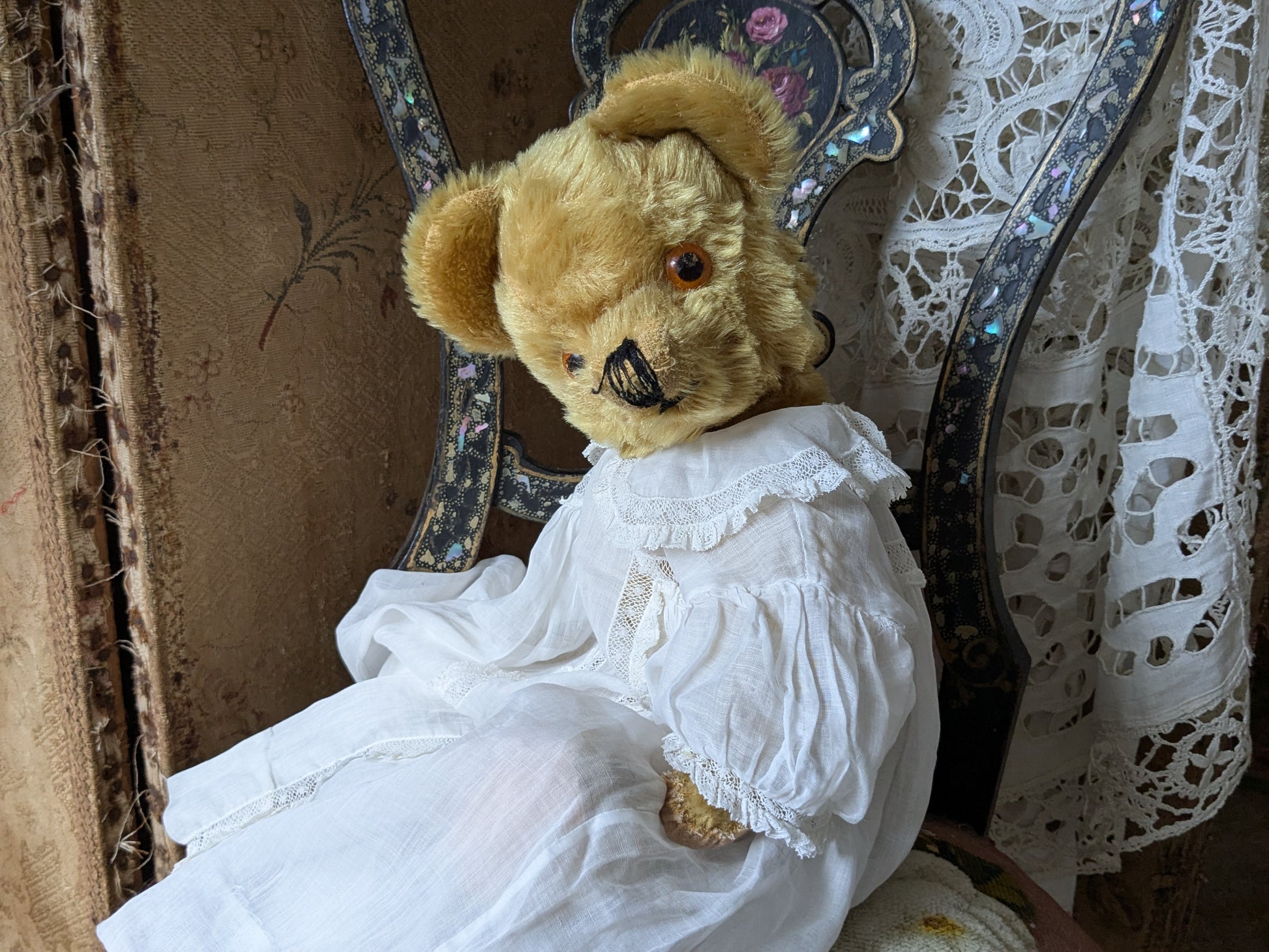 She comes dressed as shown, in a pretty little antique muslin & lace dress.