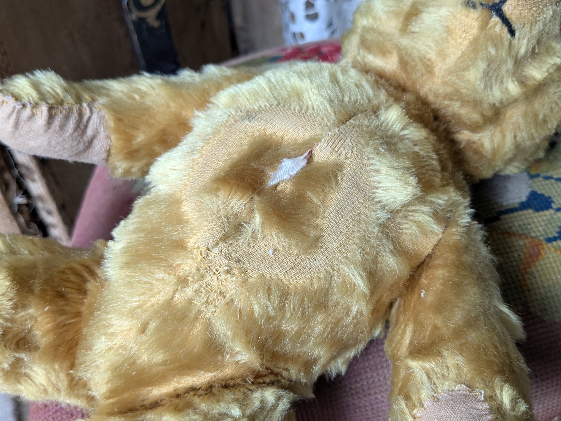 She has plastic eyes & a stitched nose. All of her joints work well.